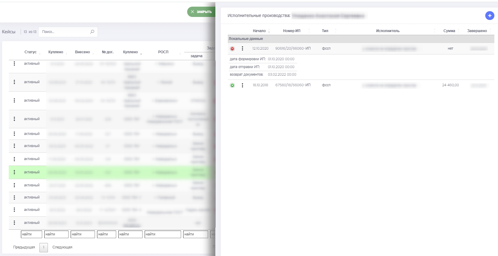 Из базы данных CRM извлекает развернутые данные о наличии исполнительного производства по должнику: долг, суд, пристав, даты.