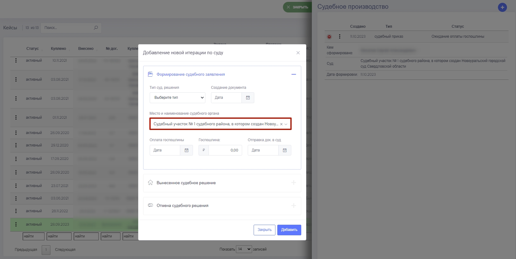 По адресу местонахождения должника, CRM автоматически, каждый час, собирает информацию и определяет подсудность: районный суд, мировой суд, судебный пристав.
