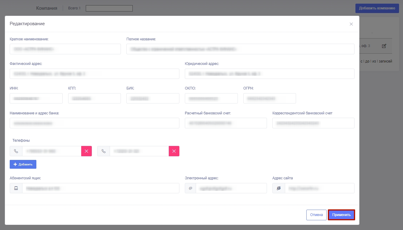 Если вы добавляете первую компанию, после нажатия откроется форма для заполнения, в соответствующие поля нужно ввести фактические данные о компании и Сохранить.