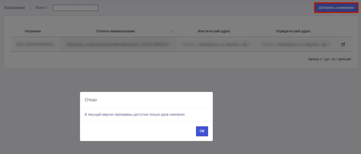 Чтобы добавить компанию и информацию о ней, необходимо нажать кнопку Добавить компанию. В CRM Simple Collect предусмотрено добавление только одного юридического лица.