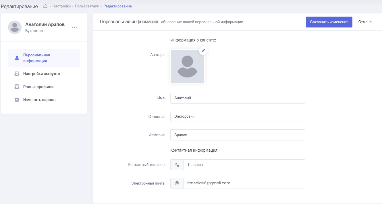 Добавить нового пользователя и задать пароль для входа в систему можно нажав на кнопку Добавить пользователя . Вариант создания пароля - автоматическая генерация, потом его можно изменить на другой в пользовательских настройках. После сохранения данных откроется расширенная форма для ввода, ее необходимо дополнить недостающими данными. Роль присваивается в соответствующих настройках.