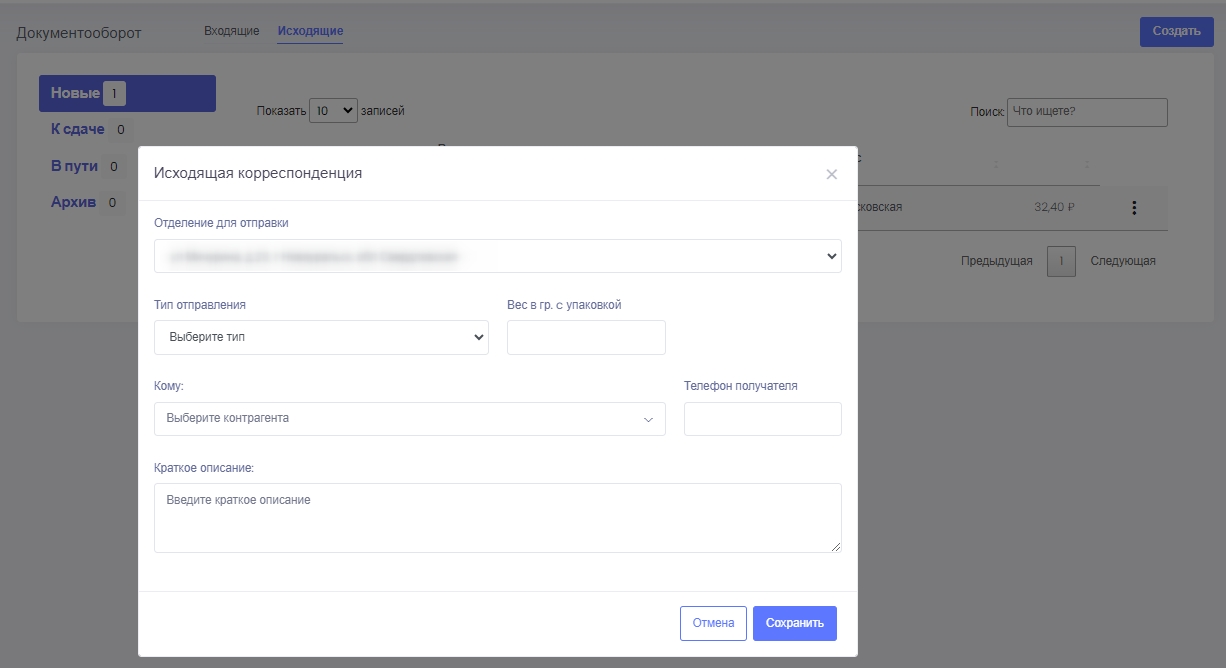 Использование аналогичного интерфейса в разделе Документооборот сокращает время на отправку, регистрацию писем компании и отслеживание почтовых расходов.