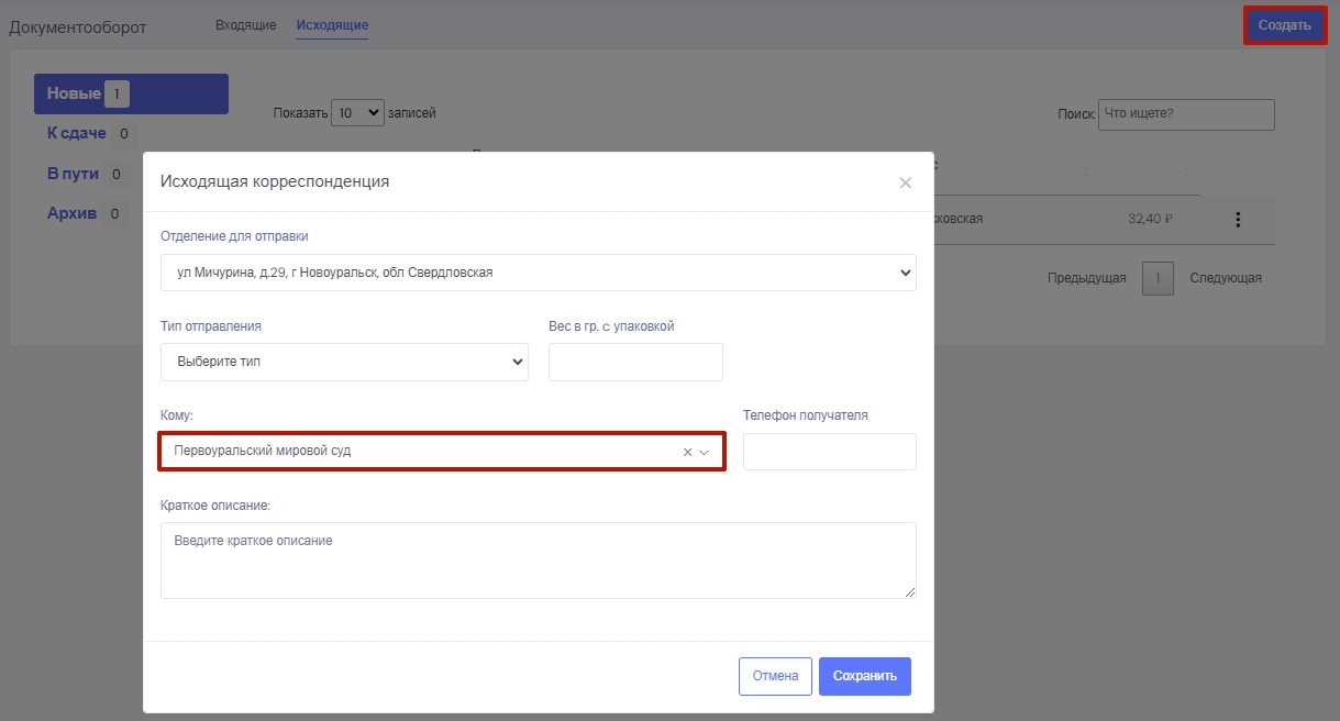 Например, для регистрации входящей корреспонденции и отправки писем в разделе Документооборот.
