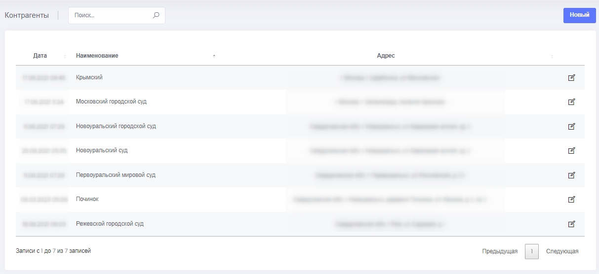 Контрагенты - редактируемый справочник организаций в том числе судебных, с которыми так или иначе происходит взаимодействие по делам должников.