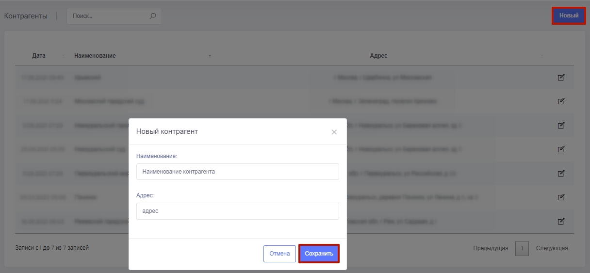 Добавить нового контрагента через кнопку Новый. Ввести правильное название и адрес.