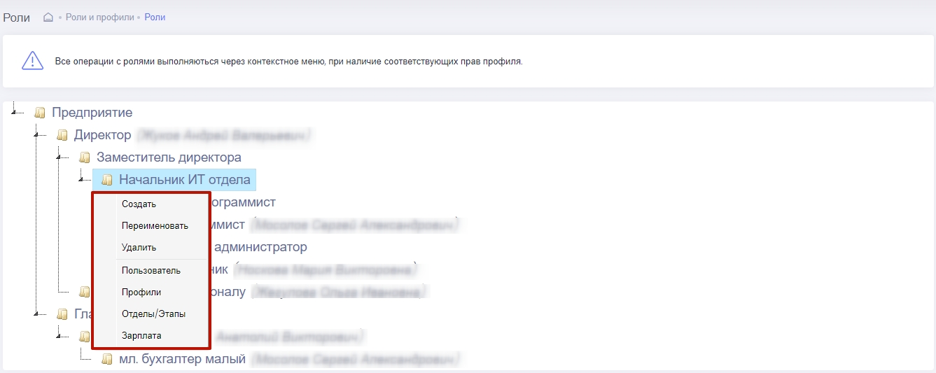 Роли это визуальное представление кадровой структуры организации. Каждый пользователь выполняет определенные задачи и в настройках есть возможность отобразить необходимую информацию наглядно для общего доступа.