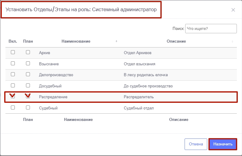Администратор назначает возможность участия в этапах рабочих процессов и учет плана для роли, если в этом есть необходимость.