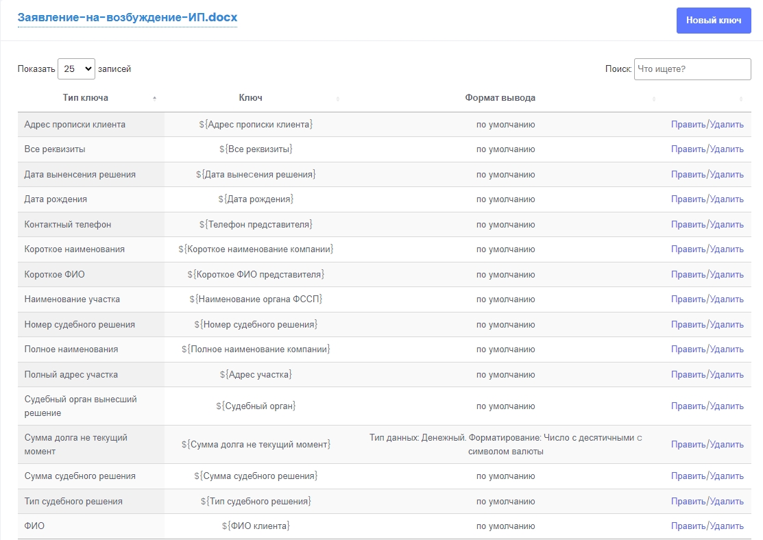 Добавление ключей производится с помощью кнопок Параметры - Новый ключ. В шаблоне документа в формате DOCX должны быть проставлены ключи в формате ${ключ} для динамических данных. Например, фамилия должника, паспортные данные или дата рождения.