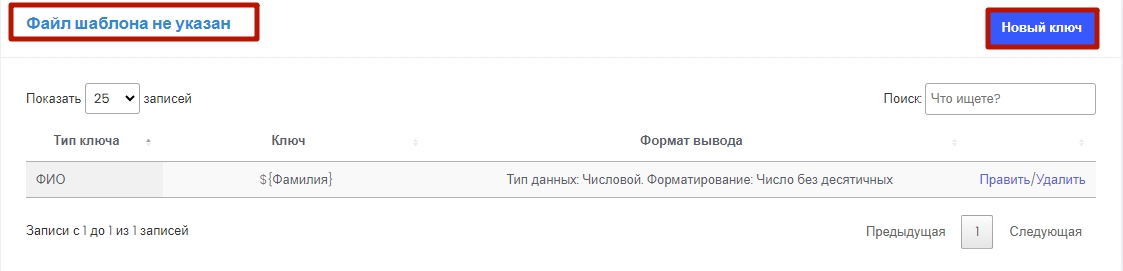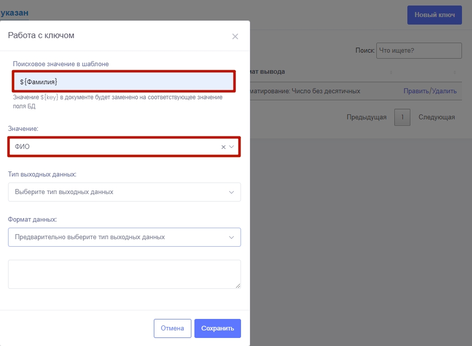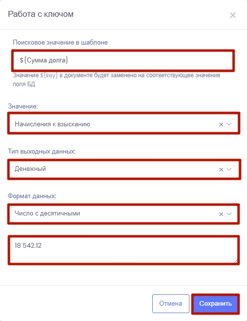 Создание ключа. Ключ - подстановочный знак, который при формировании готового документа будет заменен на данные из CRM. Например, ключ ${фамилия} будет заменен на реальную фамилию должника из базы CRM.