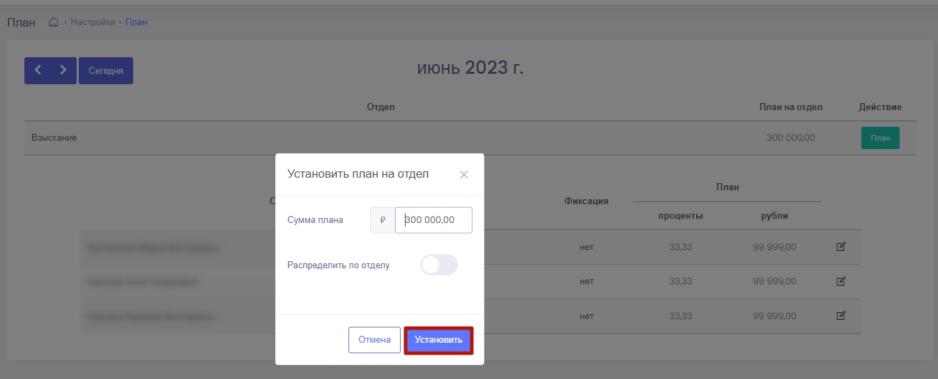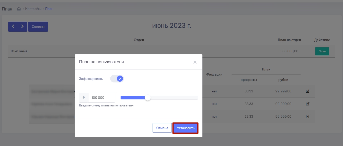 Данные по сотрудникам отдела выгружаются в форму, в настройках по каждому через кнопку Изменить фиксируется сумма, которую должен достигнуть сотрудник по сбору задолженности. По умолчанию сумма Плана на отдел делится поровну на всех сотрудников. Настройка Зафиксировать выставляет индивидуальную сумму на сотрудника, если она не включена у сотрудников оставшаяся сумма распределяется поровну. Переключение суммы плана в форме редактирования доступно с помощью бегунка и вводом цифр в поле.