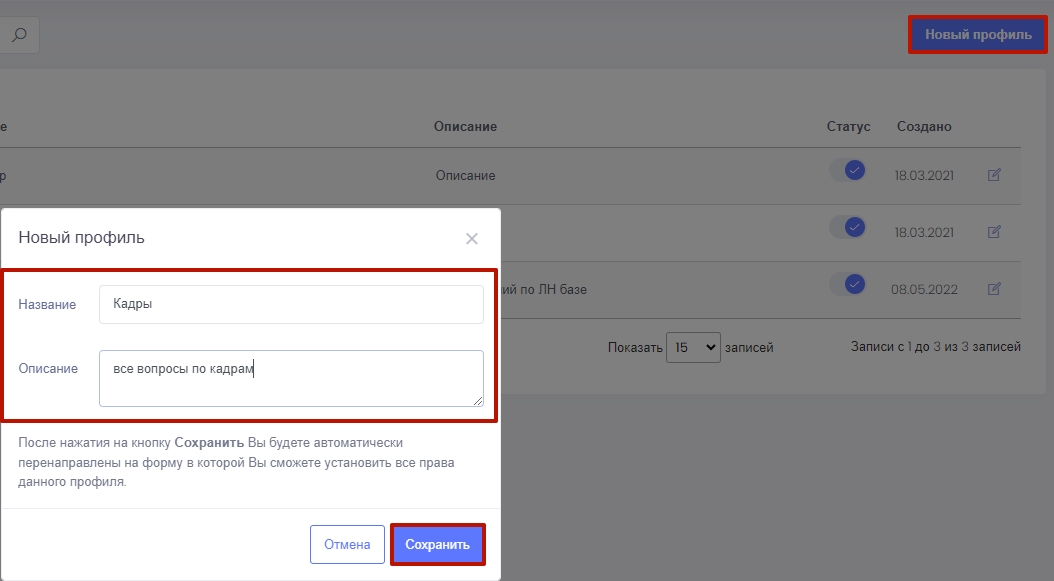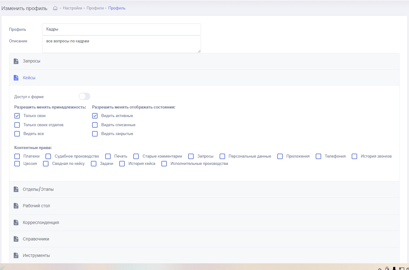 Администратор, или сотрудник с соответствующими правами имеет право ограничить доступ, расширить его при необходимости. Если к роли подключены несколько профилей, их права суммируются и присваиваются пользователю.